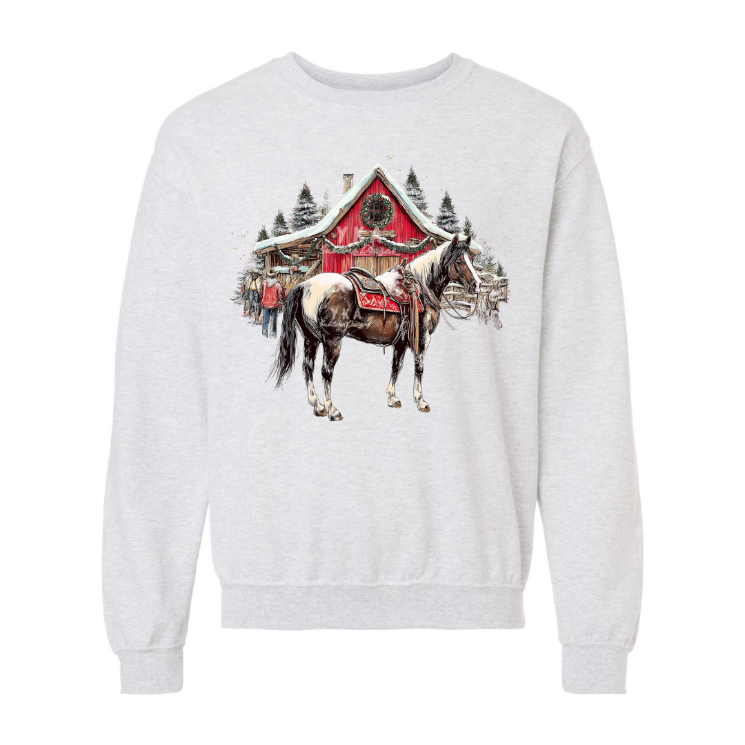 Cozy, rustic, and beautifully detailed — this Winter Cabin Horse sweater brings all the charm of a snowy holiday getaway. Featuring a hand-illustrated scene with a saddled horse standing outside a festive red cabin surrounded by pine trees, this sweatshirt feels like stepping straight into your favourite winter storybook.