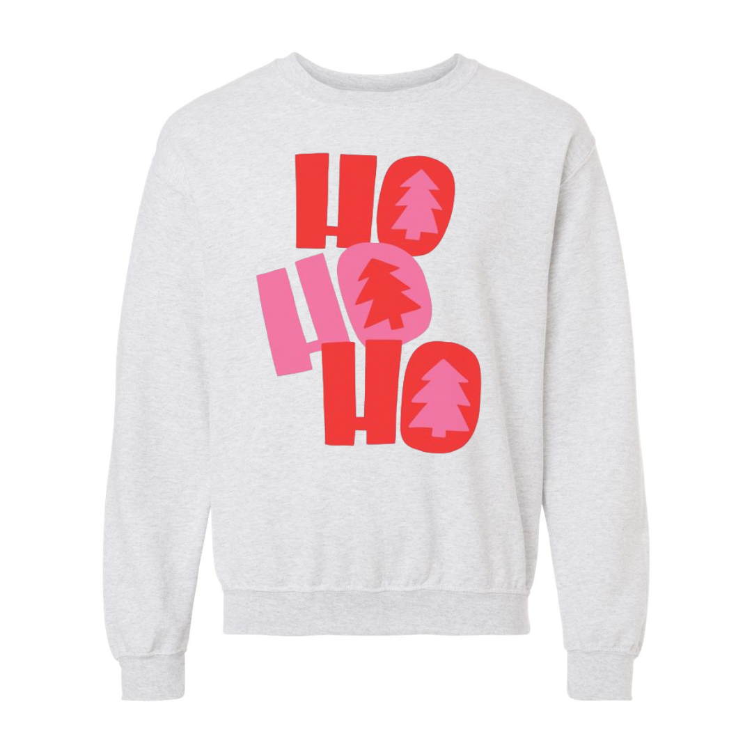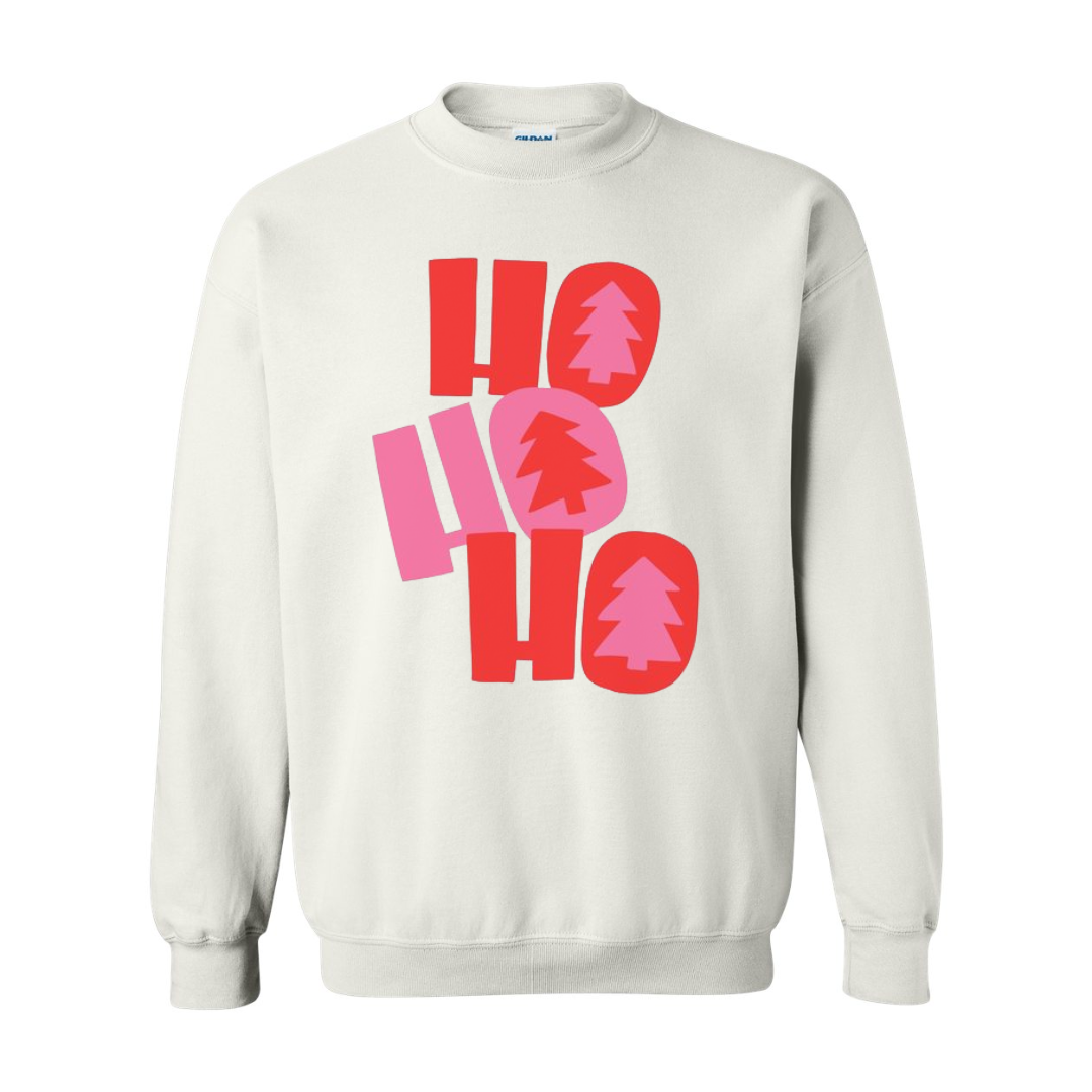 Bring the festive fun with this bold and colorful Ho Ho Ho Christmas sweatshirt. Featuring chunky retro lettering in bright red and pink with playful Christmas tree icons, this design is cheerful, modern, and totally eye-catching.